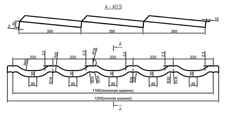 Профиль модульной металлочерепицы "Максима" имеет следующие размеры: